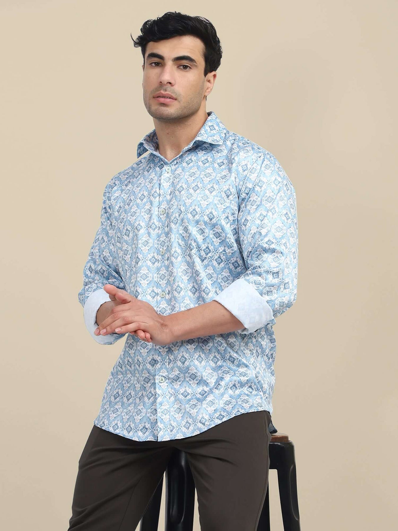 Indulge in modern sophistication with our Men's Poly Satin Lycra green Digital Printed Shirt. Crafted from a luxurious blend of poly satin and lycra fabric, this shirt offers a sleek and comfortable fit that moves with you throughout the day. The striking digital print in shades of blue adds a contemporary edge, elevating your ensemble effortlessly. Whether you're attending a special event or simply want to stand out with a unique style, this shirt is sure to make a statement. Pair it with tailored trousers for a polished look or dress it down with jeans for a more casual vibe. Embrace versatility and refinement with this standout piece in your wardrobe rotation.