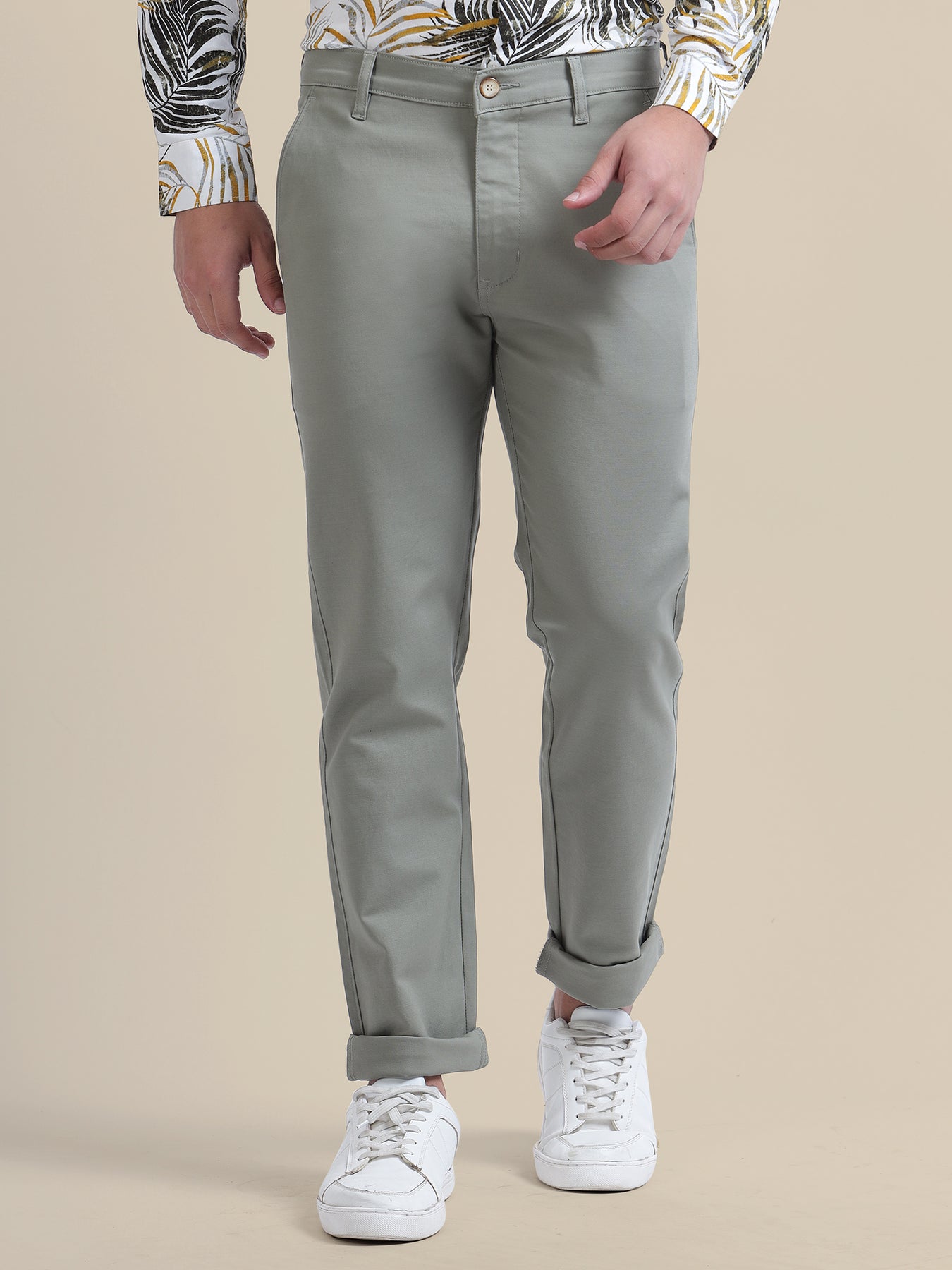Mid-rise chinos featuring a solid pattern. These chinos are designed with a button closure and come equipped with four pockets for added functionality and style.