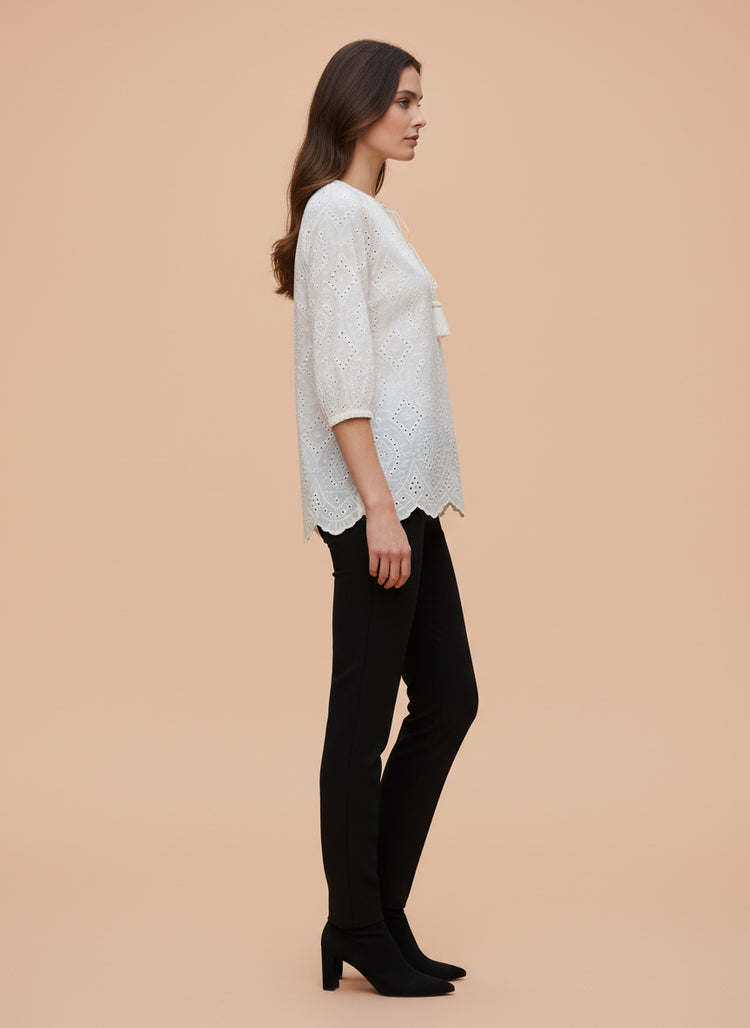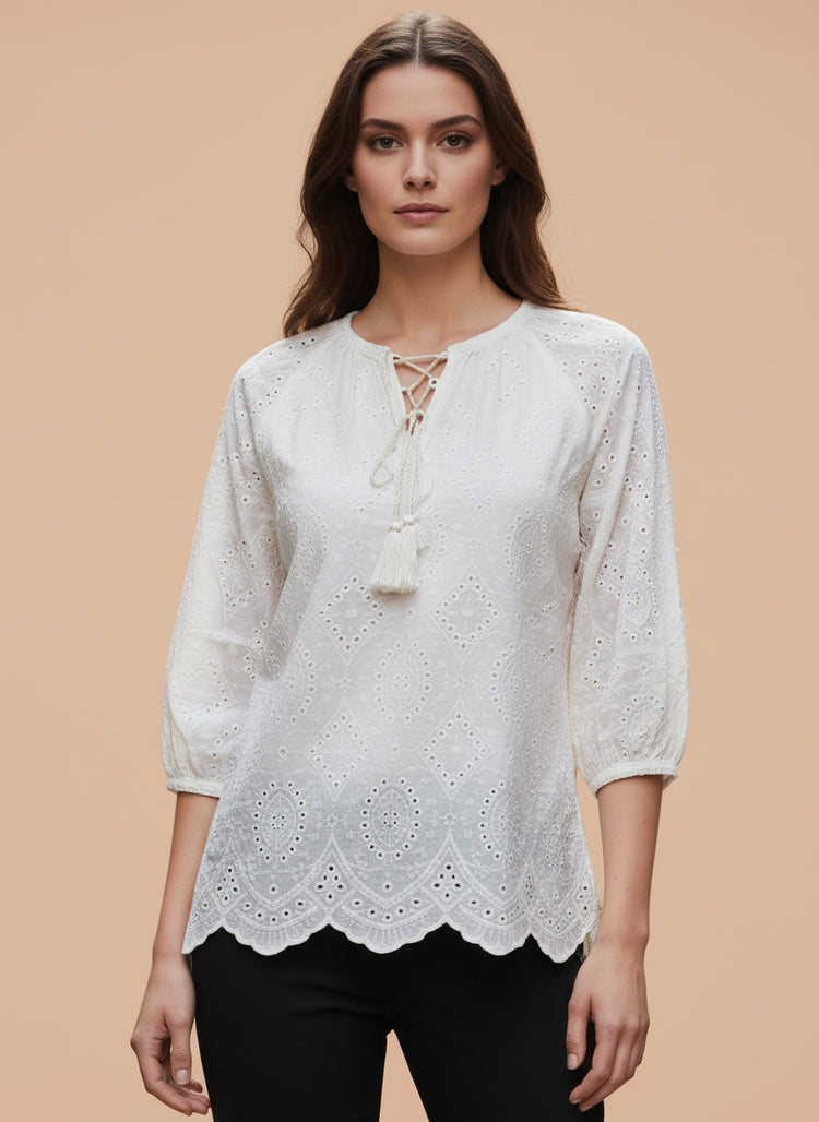 Chic Cutwork Women’s Top with Tassel Tie