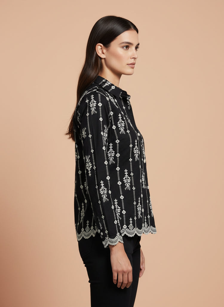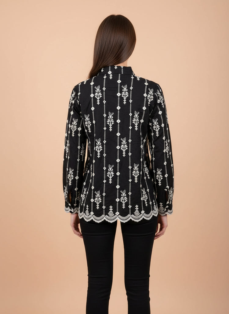 Upgrade your everyday style with this elegant black embroidered women’s shirt, designed for a refined and modern look. Crafted from soft, breathable fabric, this shirt features delicate all-over embroidery and a classic button-down front that adds a touch of sophistication. The scalloped hem enhances its feminine appeal, while the full sleeves and tailored fit ensure all-day comfort.
