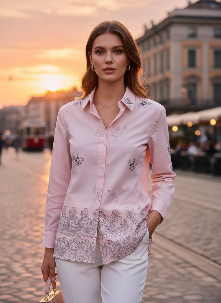 Step into refined elegance with this luxurious blush pink women’s long shirt, crafted to elevate your everyday style. Featuring intricate embroidery motifs across the front and a beautifully detailed embroidered hem, this shirt delivers a rich and sophisticated look. The classic collar with front button closure adds a smart finish, while the soft breathable fabric ensures all-day comfort. Perfect for office wear, evening outings, or smart casual occasions, this piece pairs effortlessly with trousers or leggings.