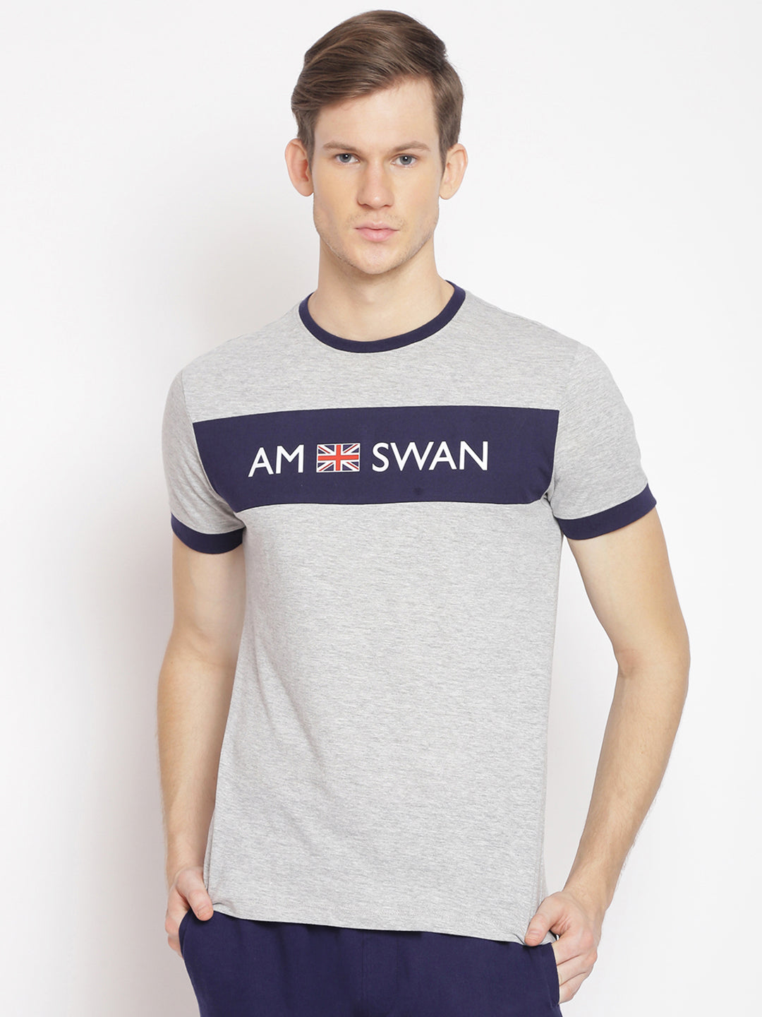 The Amswan Men's premium cotton grey color block half-sleeved t-shirt is likely crafted from high-quality cotton, offering a soft and comfortable feel against the skin. The grey color block design adds a stylish and modern touch to the t-shirt. With a focus on premium quality, this shirt may feature a well-constructed design and attention to detail, providing a durable and long-lasting garment.