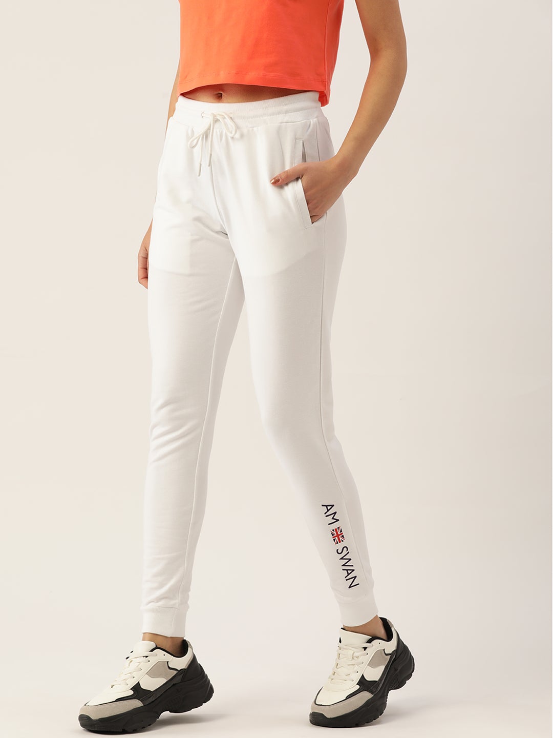Womens Premium White Cotton Lycra Smart Fit Printed Track Pant